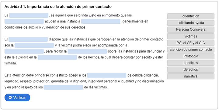 Este curso tiene como objetivo fortalecer el desempeño de las personas Consejeras, integrantes de Comités de Ética y Órganos Internos de Control para garantizar la atención integral a víctimas y el acceso a la justicia, a través de ejercitar habilidades y aptitudes al aplicar la perspectiva de género y el enfoque de derechos humanos, tal como lo disponen el Protocolo para la prevención, atención y sanción del hostigamiento sexual y acoso sexual (Protocolo) y la Competencia Atención a presuntas víctimas de hostigamiento sexual y acoso sexual en la APF.