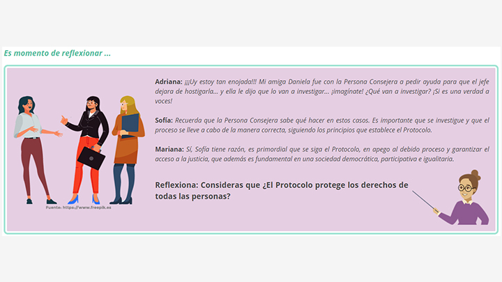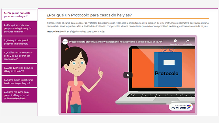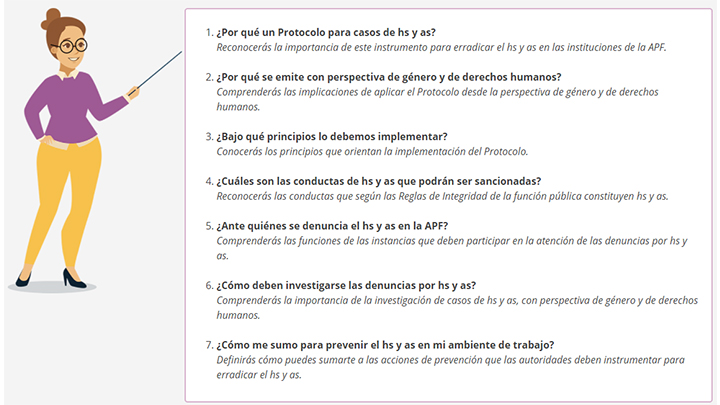 Este curso se centra en el Protocolo con el objetivo de facilitar la comprensión de sus disposiciones y motivarte a participar en la construcción de ambientes laborales de Cero Tolerancia al hostigamiento y acoso sexual, y favorecer la construcción de una cultura de igualdad laboral.